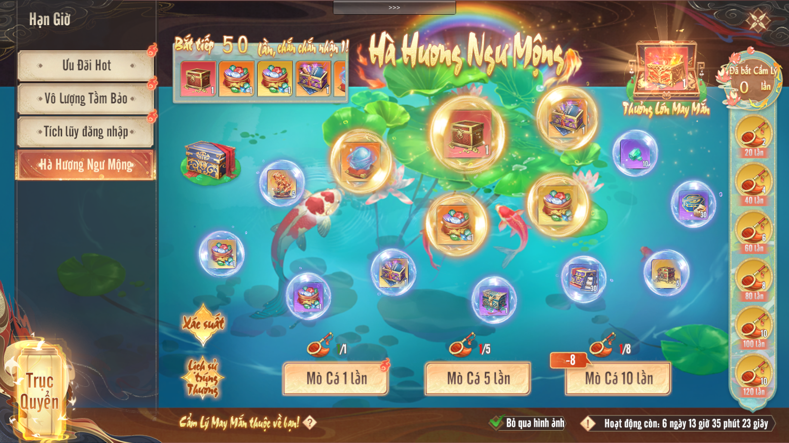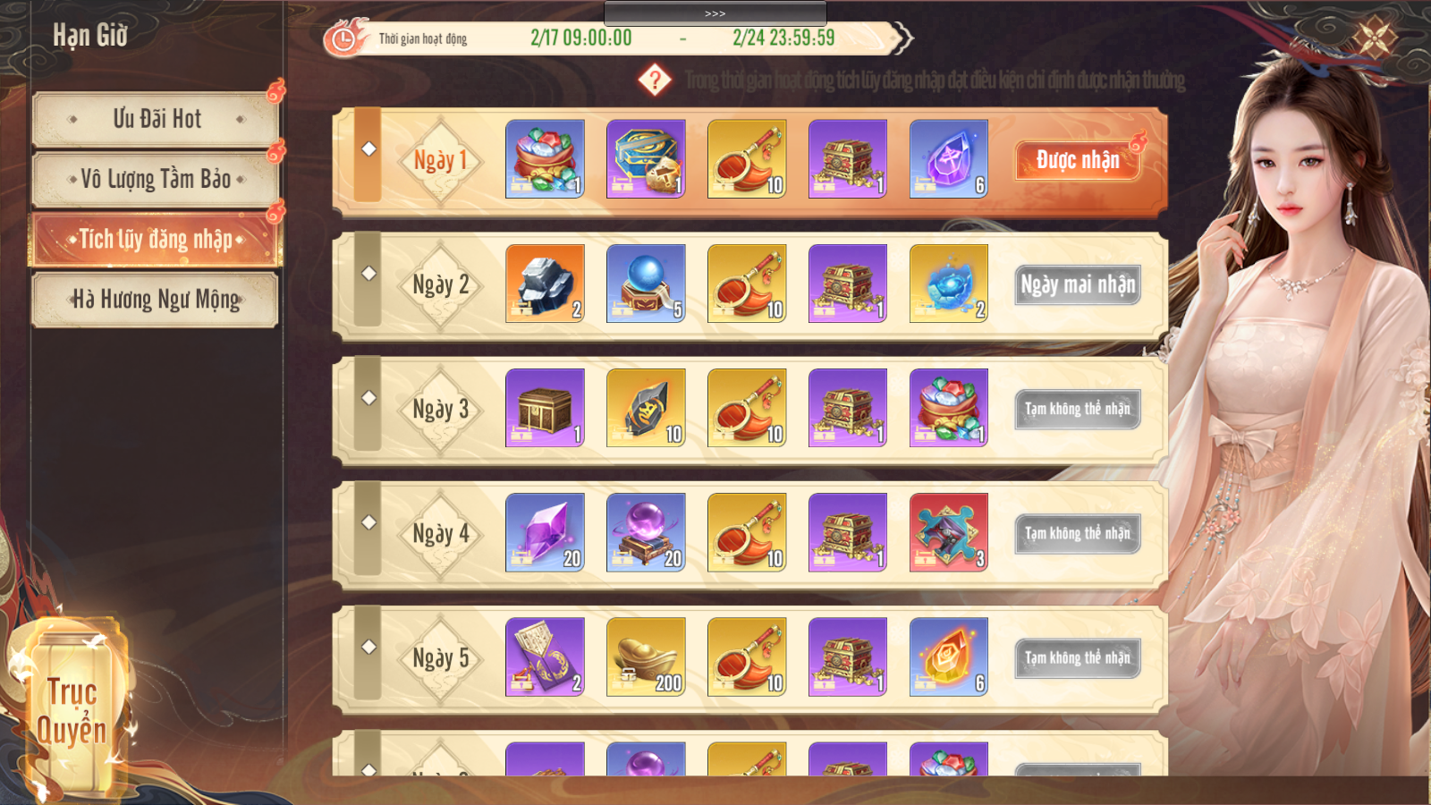 ĐẶC BIỆT: Từ 09:00 17.02 - 23:59 24.02, Tích Lũy Đăng Nhập liên tục 7 ngày để nhận những phần quà hấp dẫn, trong đó có 70 Ngư Mộng Võng dùng để tham gia sự kiện Hà Hương Ngư Mộng HOÀN TOÀN MIỄN PHÍ!