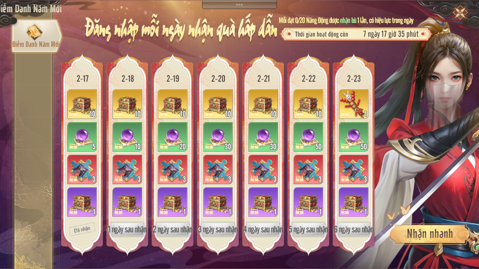 Nội dung: Trong thời gian diễn ra sự Kiện Thiếu Hiệp đăng nhập vào game mỗi ngày để nhận những phần quà hấp dẫn, nếu bỏ lỡ cần đạt 20 điểm năng động cho ngày tiếp theo để nhận bù.
