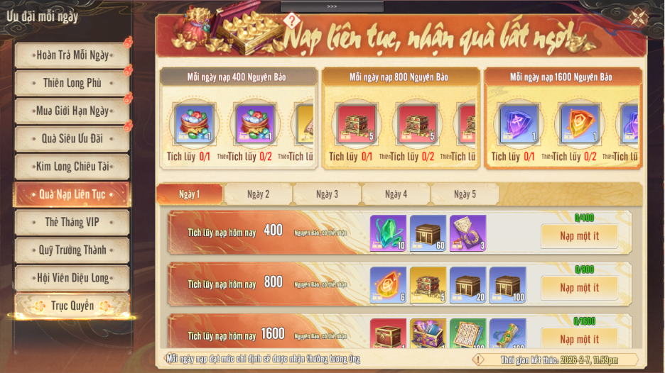 - Mỗi ngày nạp đạt đến mức quy định có thể nhận thưởng tương ứng.
