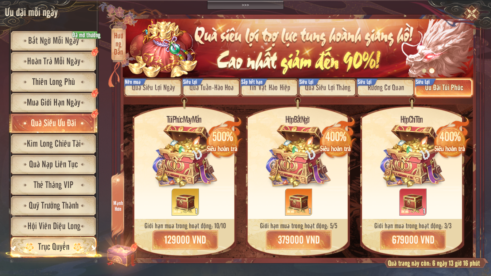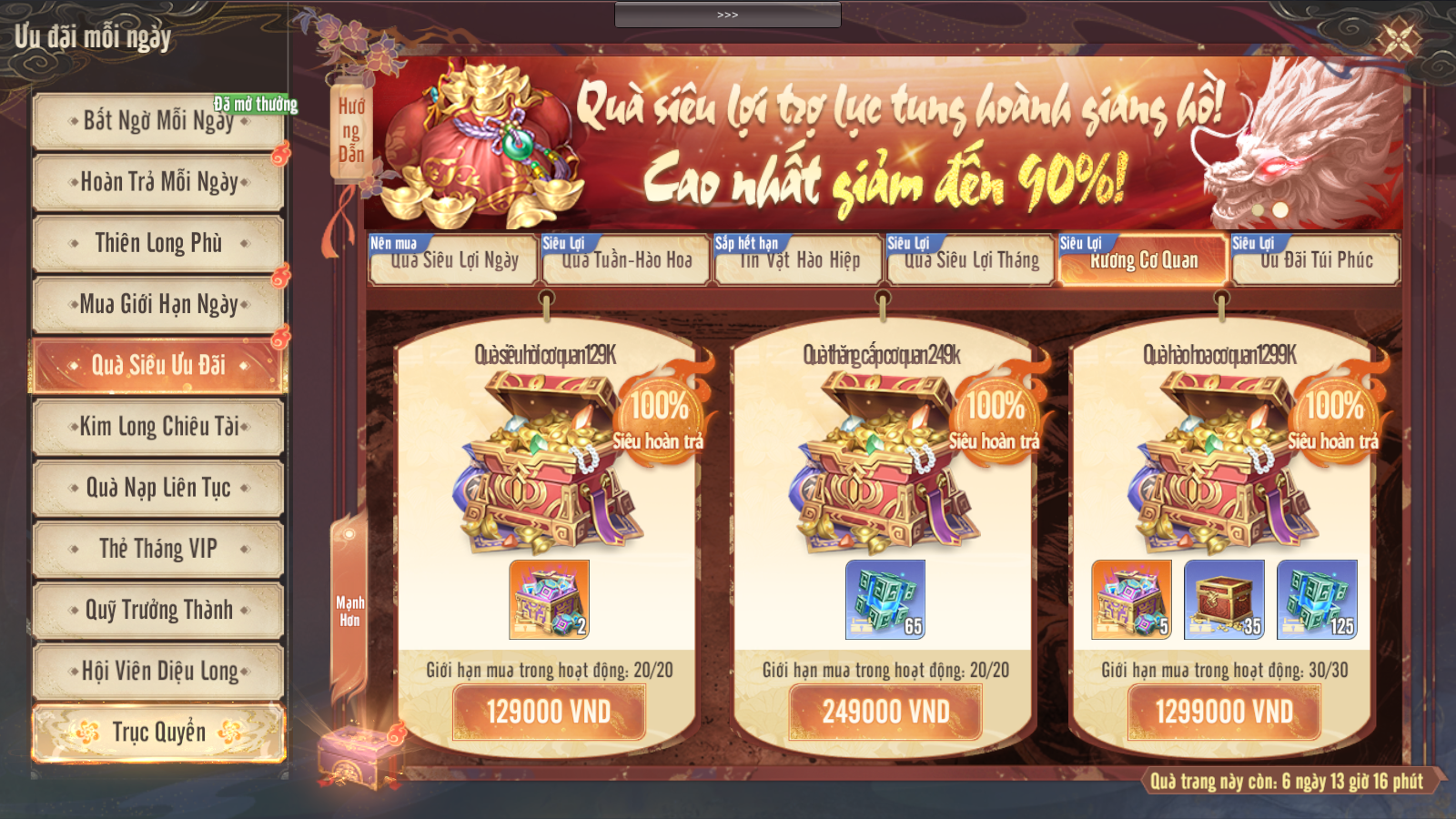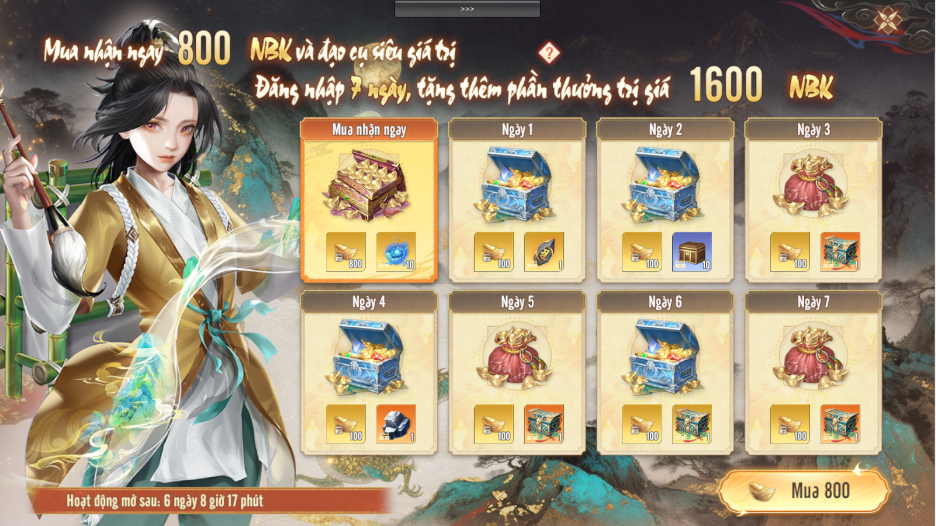 - Thiếu Hiệp vào giao diện Trục Quyển dùng 800 Nguyên Bảo để mua gói quà Tuần. Sau khi mua, đăng nhập vào game mỗi ngày để nhận thưởng tương ứng!