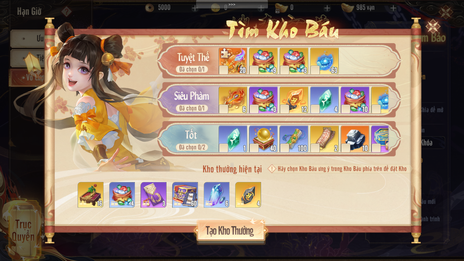 Kho Báu lần lượt tự chọn từ 3 phẩm chất kho thưởng (Tốt, Siêu Phàm, Tuyệt Thế), mỗi loại kho thưởng có thể chọn số lượng phần thưởng không giống, sau khi chọn kho thưởng sẽ gồm phần thưởng đã chọn và phần thưởng mặc định.