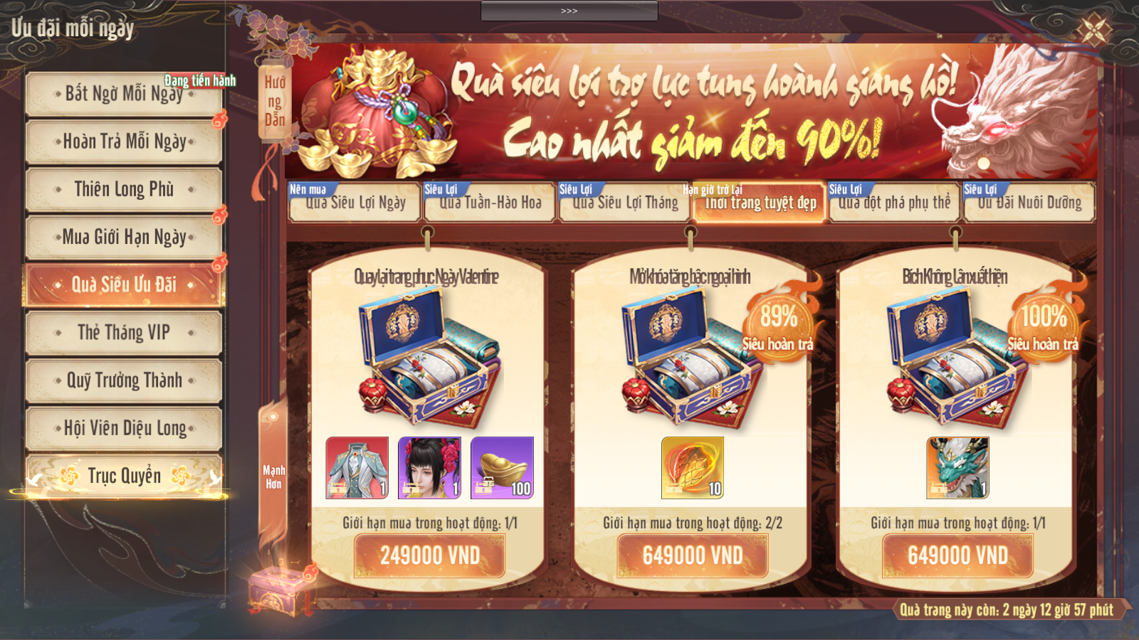 | Top 3 | 2 Rương tự chọn Mảnh Phục Hy và Viêm Đế, 5 Tinh Túy Trùng Lâu Giới, 1 Song Long Hồn 9 Sao Tự Chọn |