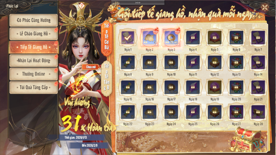 Nội dung: Trong thời gian diễn ra sự Kiện Thiếu Hiệp kích hoạt tiếp tế tiến cấp có thể nhận thưởng tiếp tế mỗi ngày, nếu bỏ lỡ cần nạp mỗi mốc 10 NB để tiếp tục nhận.