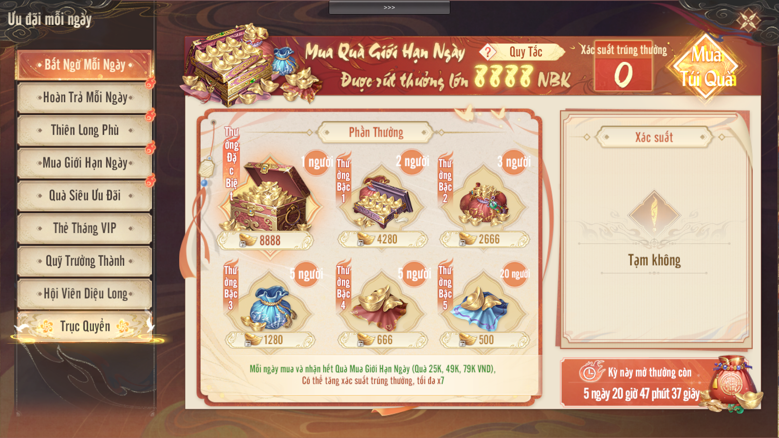 - Mỗi khi mua và nhận lại toàn bộ 3 gói Quà Giới Hạn Ngày sẽ tăng xác suất trúng thưởng, tối đa là x7.