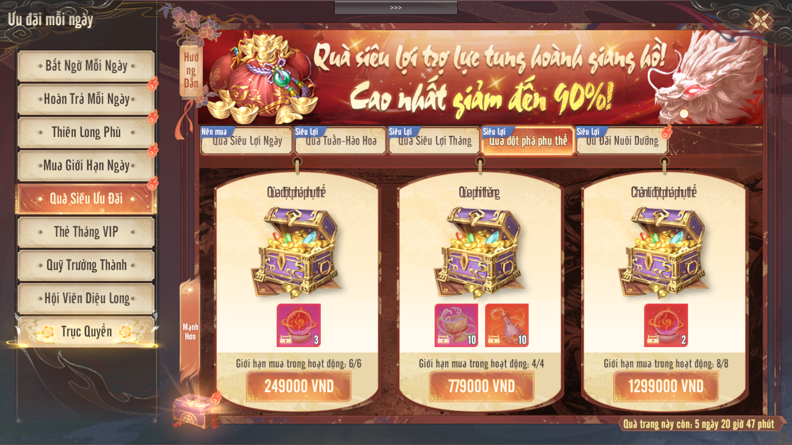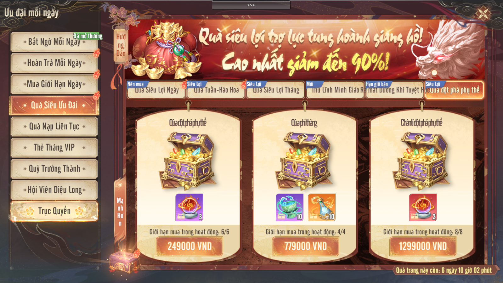 - Mua Quà Hạn Giờ, Quà Mua Trực Tiếp không tính vào tiến độ nạp Phiếu Rút Thưởng.