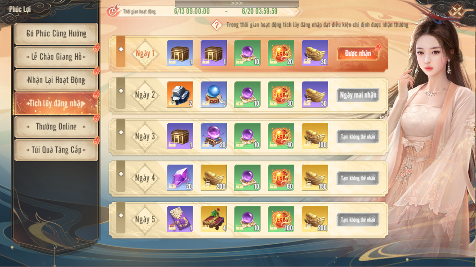 - Ngày 5: 1 Sổ Tay Lĩnh Hội Tuyệt Học, 4 Nhân Sâm 10 Năm, 10 Dưỡng Nguyên Đơn, 100 Võ Lực Đơn - Lớn, 200 NBK.
