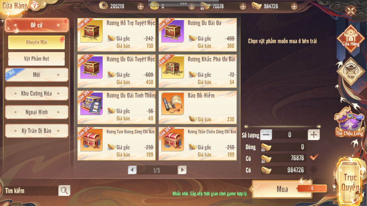 | 2 | Thời trang - Thanh Ảnh Phạn Quang 7N | 5 | Tinh Túy Trùng Lâu Giới khóa | 8 | Tự chọn đá quý giảm kháng lv6 | 2 | Tự chọn Sơn Hà Đồ đỏ | 1 |