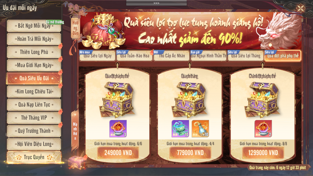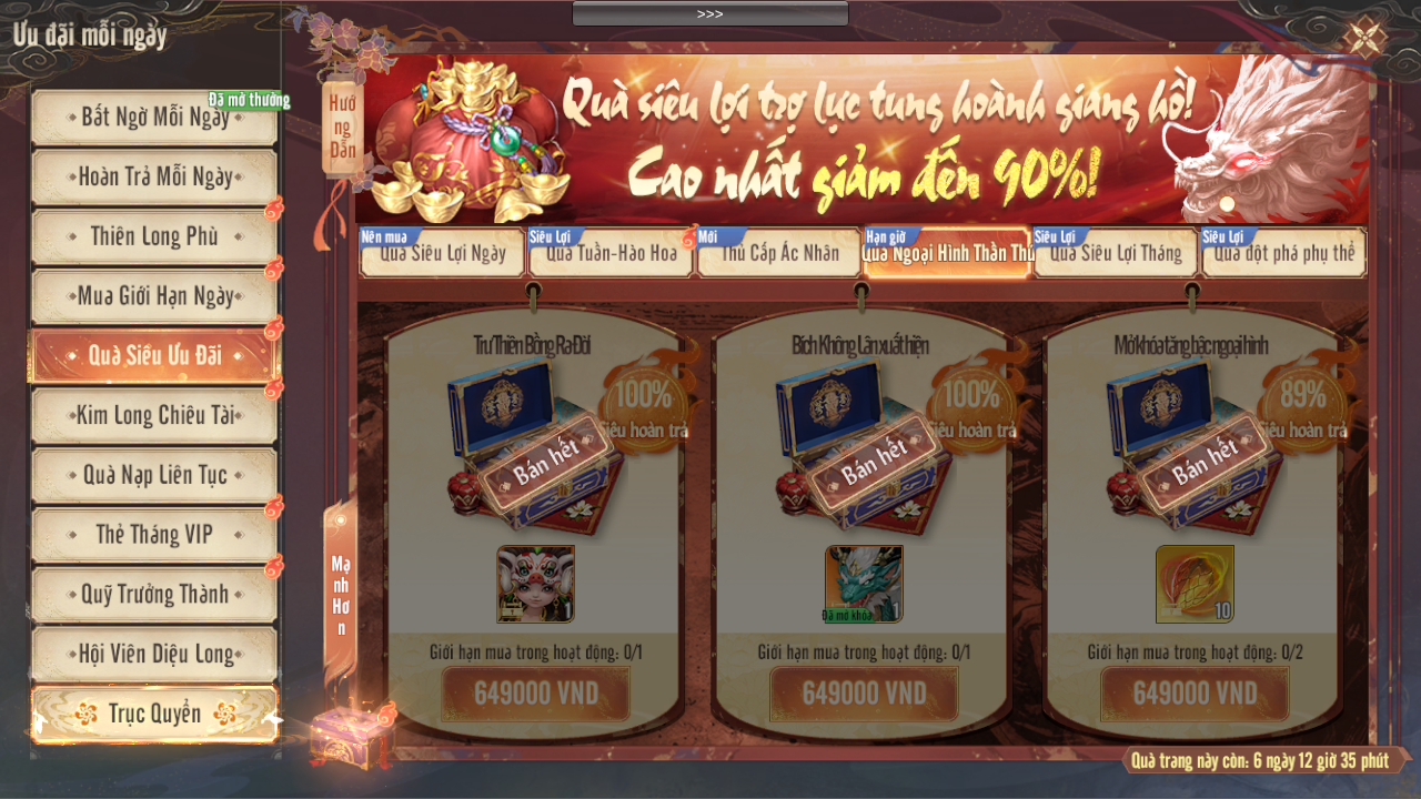 - Mua Quà Hạn Giờ, Quà Mua Trực Tiếp không tính vào tiến độ nạp Phiếu Rút Thưởng.