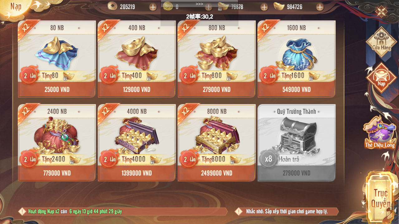 - Thiếu Hiệp mua trực tiếp các gói NB trong in-game trước đó, khi đăng nhập lần đầu tiên trong thời gian diễn ra hoạt động sẽ reset quyền lợi x2 nạp lần đầu ở các gói NB trong in-game.