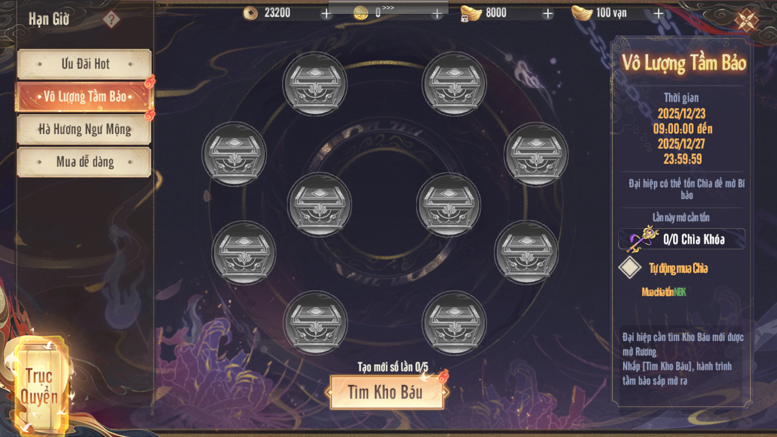 Mỗi vòng, lần đầu mở Kho Báu tốn 0 Chìa Khóa Tầm Bảo, sau đó mỗi lần tầm bảo sẽ tốn Chìa Khóa Tầm Bảo, số chìa khóa tăng dần.