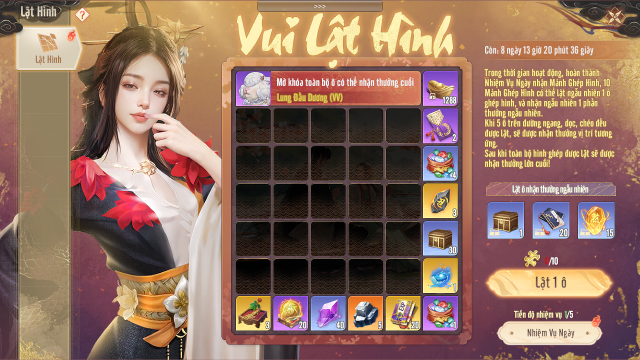 - Hoàn thành nhiệm vụ mỗi ngày nhận Mảnh Ghép Hình, 10 Mảnh Ghép Hình có thể lật ngẫu nhiên 1 ô ghép hình, và nhận phần thưởng ngẫu nhiên.
