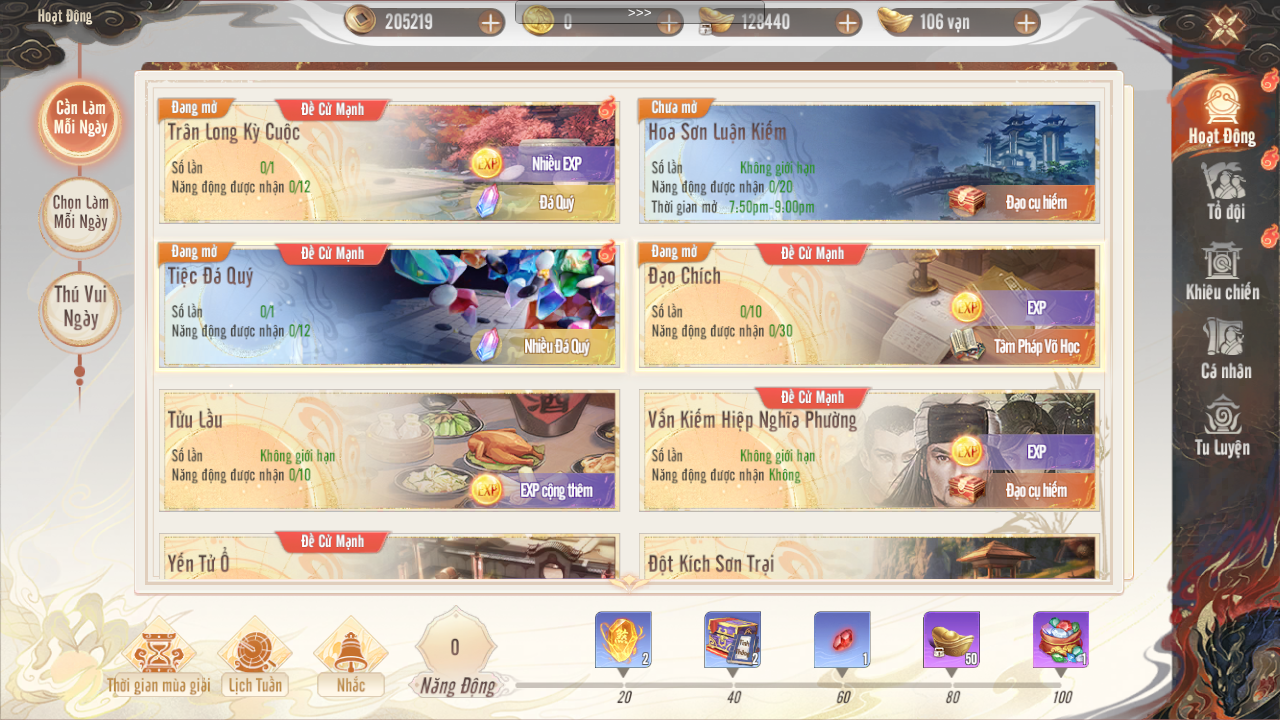 | 120 | Rương Đá Qúy lv2 | 10 | Tẩy Luyện Đơn | 5 | Võ Lực Đơn-Lớn | 5 | - | |
