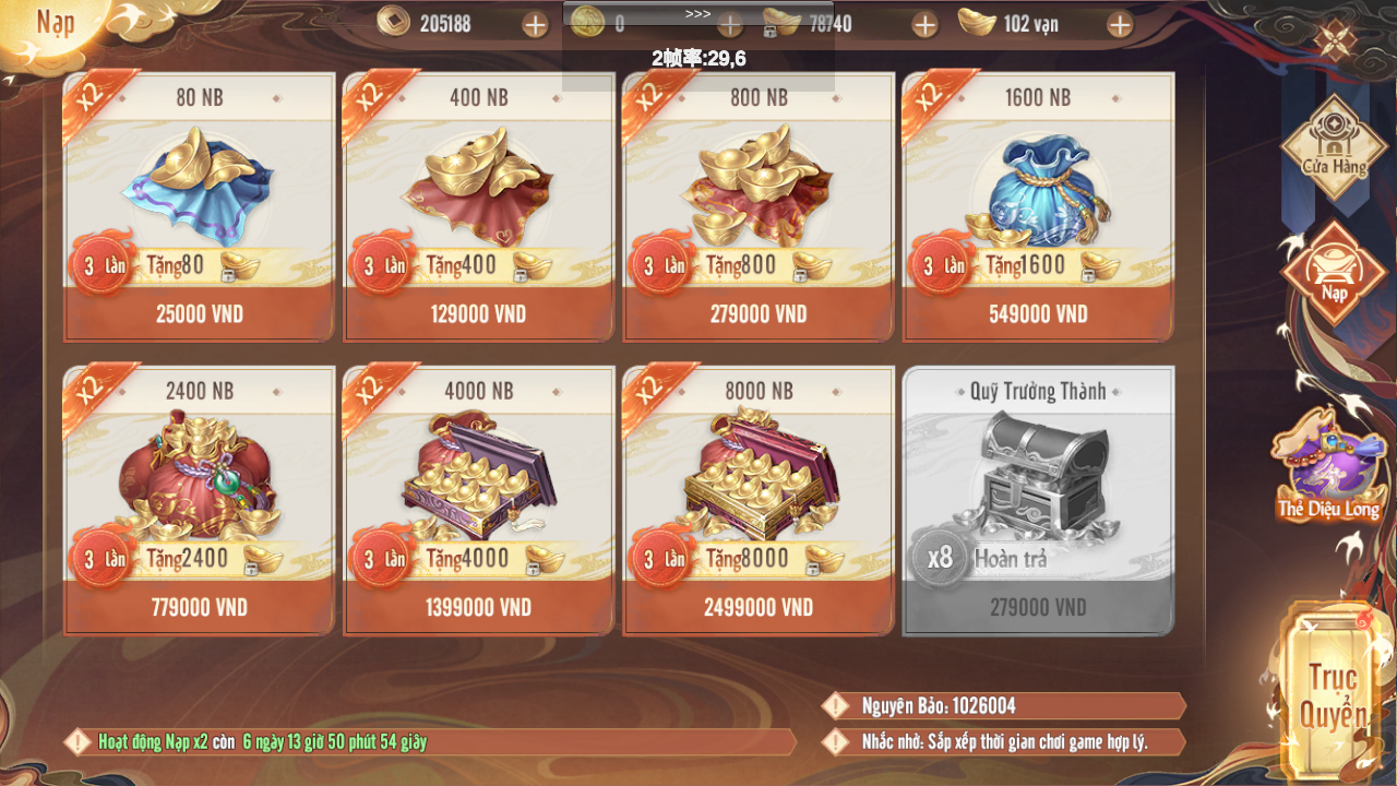 - Thiếu Hiệp mua trực tiếp các gói NB trong in-game trước đó, khi đăng nhập lần đầu tiên trong thời gian diễn ra hoạt động sẽ reset quyền lợi x2 nạp lần đầu ở các gói NB trong in-game.