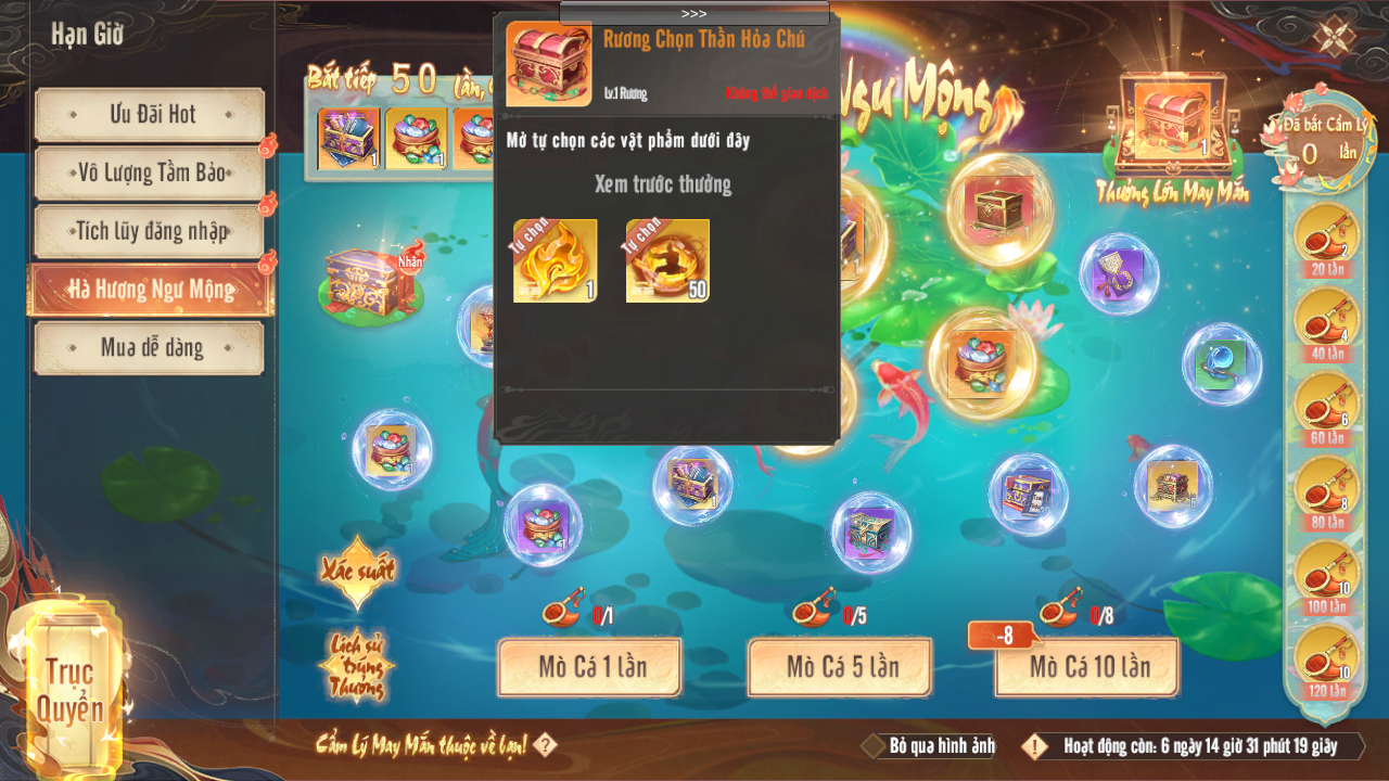 - Thiếu Hiệp dùng vật phẩm Ngư Mộng Võng được bán trong cửa hàng để tiến hành vớt cá, vớt càng nhiều tỷ lệ trúng vật phẩm hiếm càng cao!