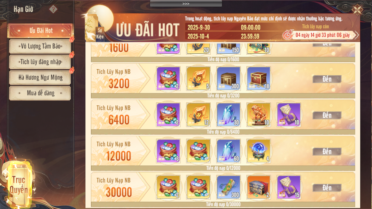 - Ví dụ: Kỳ hoạt động này mở 5 ngày, vào ngày thứ 4 của hoạt động, thiếu hiệp nạp lần đầu 2400 Nguyên Bảo, thì sẽ ưu tiên bổ sung vào tất cả mức 400 Nguyên Bảo trong 4 ngày này, mức nạp dư ra sẽ bổ sung vào mức 800 Nguyên Bảo của ngày 1.Trong thời gian hoạt động, tất cả nạp đều tính vào hoạt động lần này (Gồm Quà Mua Trực Tiếp).
