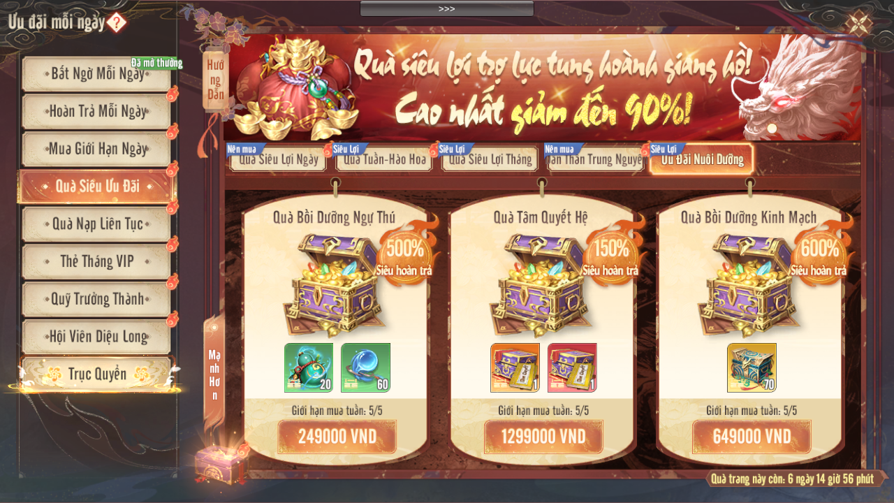 Khi nạp và nhận Nguyên Bảo, tiến độ Phúc Lợi Nạp sẽ tăng theo mức tương ứng, mua Bí Điển Giang Hồ/Thiên Long Phù cũng sẽ tích lũy tiến độ Nguyên Bảo tương ứng với giá, mua Quà Hạn Giờ, Quà Siêu Ưu Đãi không tính vào tiến độ.