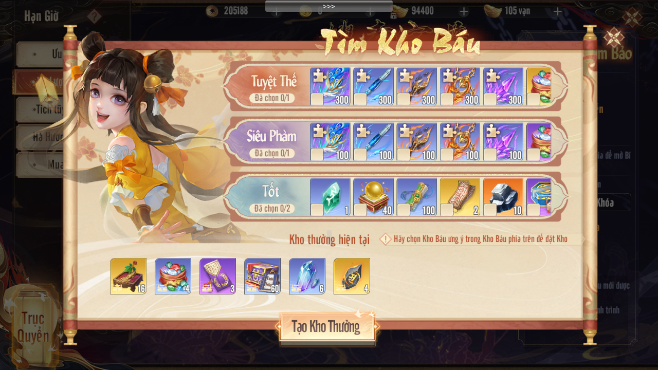 Kho Báu lần lượt tự chọn từ 3 phẩm chất kho thưởng (Tốt, Siêu Phàm, Tuyệt Thế), mỗi loại kho thưởng có thể chọn số lượng phần thưởng không giống, sau khi chọn kho thưởng sẽ gồm phần thưởng đã chọn và phần thưởng mặc định.