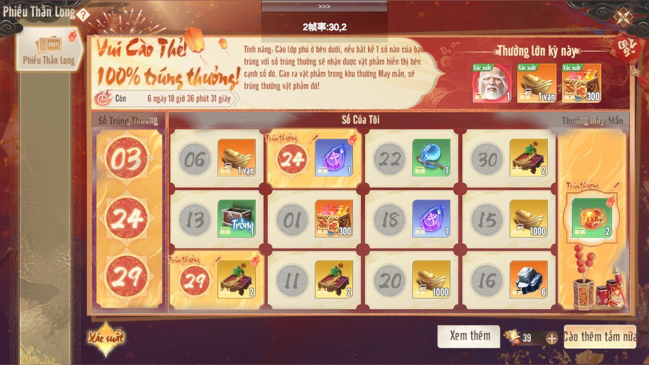 - Cào lớp phủ bên dưới, nếu 1 số ngẫu nhiên trong số của bạn giống với số giải thưởng thì bên cạnh số sẽ hiển thị Vật Phẩm.